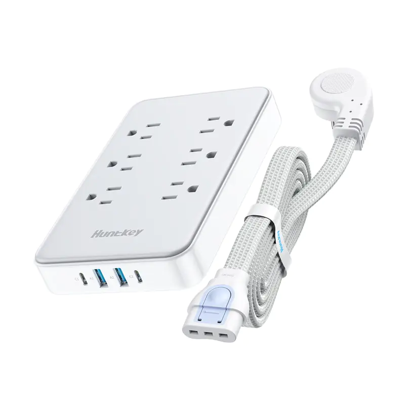 The Huntkey USB charging station caters to various needs with its detachable extension cords, allowing users to swap between 4ft, 10ft, and 16ft flat cables. This feature makes it convenient for home, office, or travel use. Additionally, the wide-spaced outlets provide enough room to accommodate bulky plugs without crowding, ensuring a clutter-free setup. By integrating six AC outlets with four USB ports (two USB-C and two USB-A), Huntkey ensures users can charge multiple devices simultaneously, including laptops, smartphones, and other electronics.